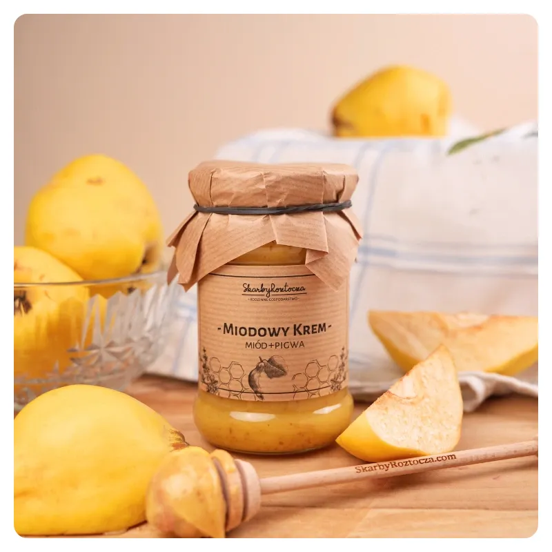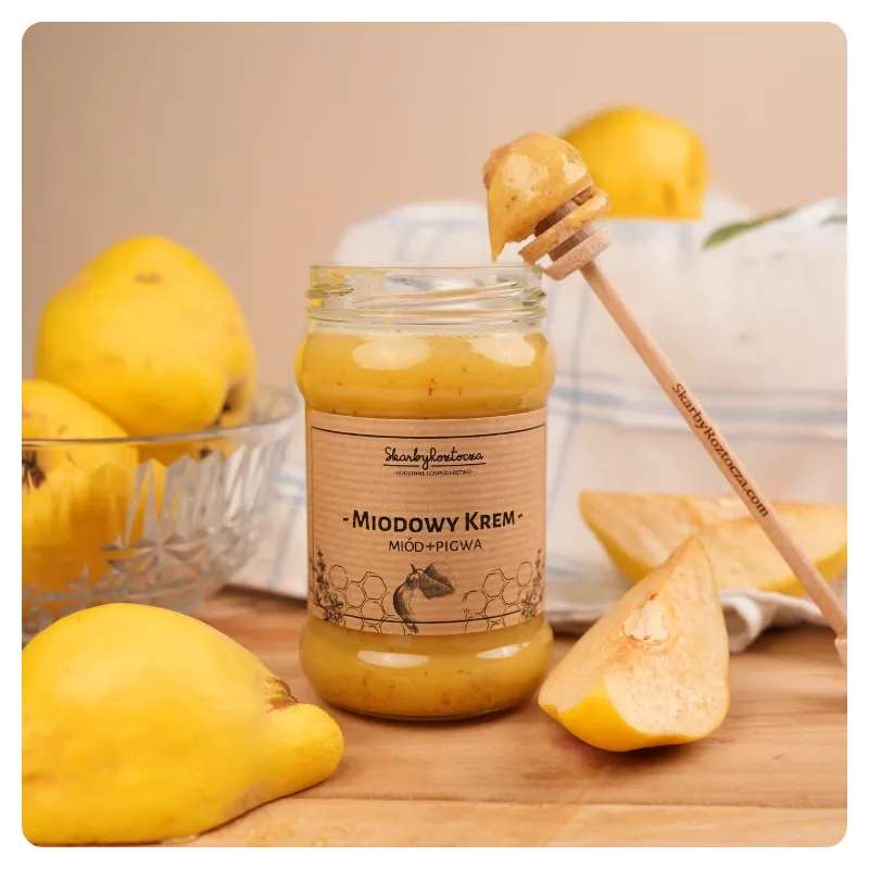 Unikalny smak: Miód z pigwą charakteryzuje się niepowtarzalnym smakiem, który łączy słodycz miodu z kwaskowymi nutami pigwy. To połączenie tworzy wyjątkową kompozycję smakową, która może wzbogacić różnorodność potraw i napojów.
