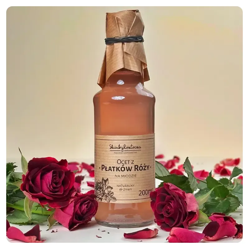 W kosmetyce ocet z płatków róży jest ceniony jako naturalny tonik do skóry, który łagodzi podrażnienia, nawilża i działa antybakteryjnie. W kuchni sprawdza się doskonale jako aromatyczny dodatek do deserów, napojów, lemoniad i herbat ziołowych, nadając im subtelnej kwiatowej nuty.