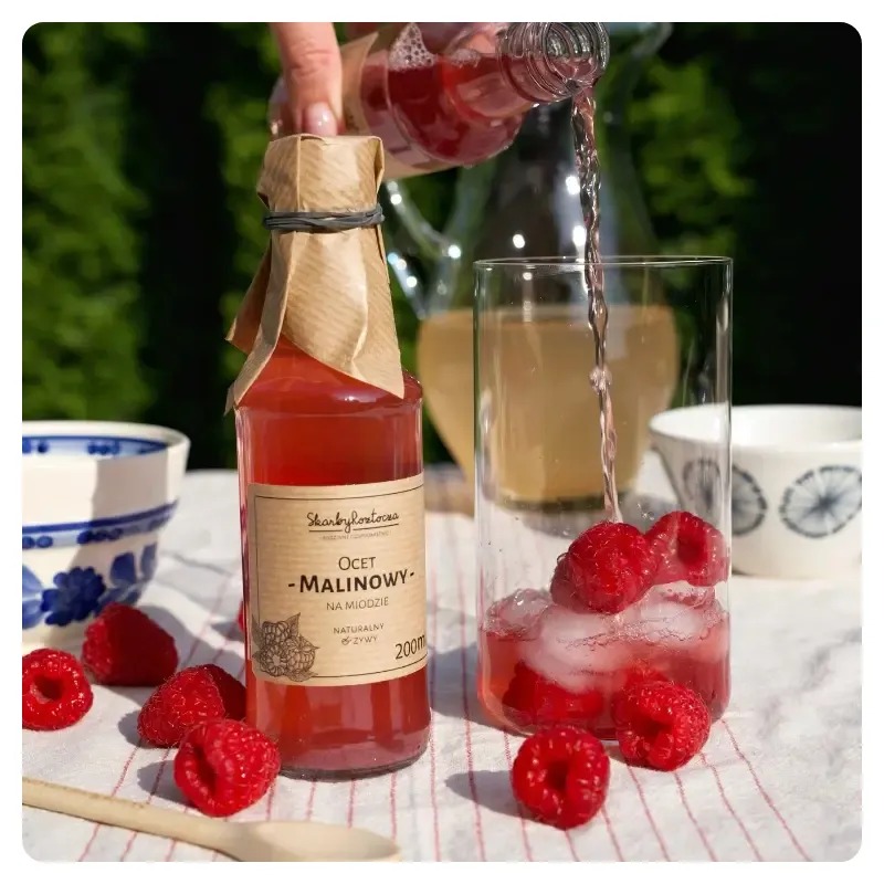 Ocet malinowy na miodzie to naturalny produkt fermentacji malin z dodatkiem surowego miodu, łączący bioaktywne związki owoców z właściwościami antybakteryjnymi i odżywczymi miodu. Zawiera liczne antyoksydanty, w tym antocyjany, flawonoidy, witaminę C i kwas elagowy, które wykazują silne działanie przeciwutleniające i wspierają mechanizmy ochronne organizmu przed stresem oksydacyjnym.