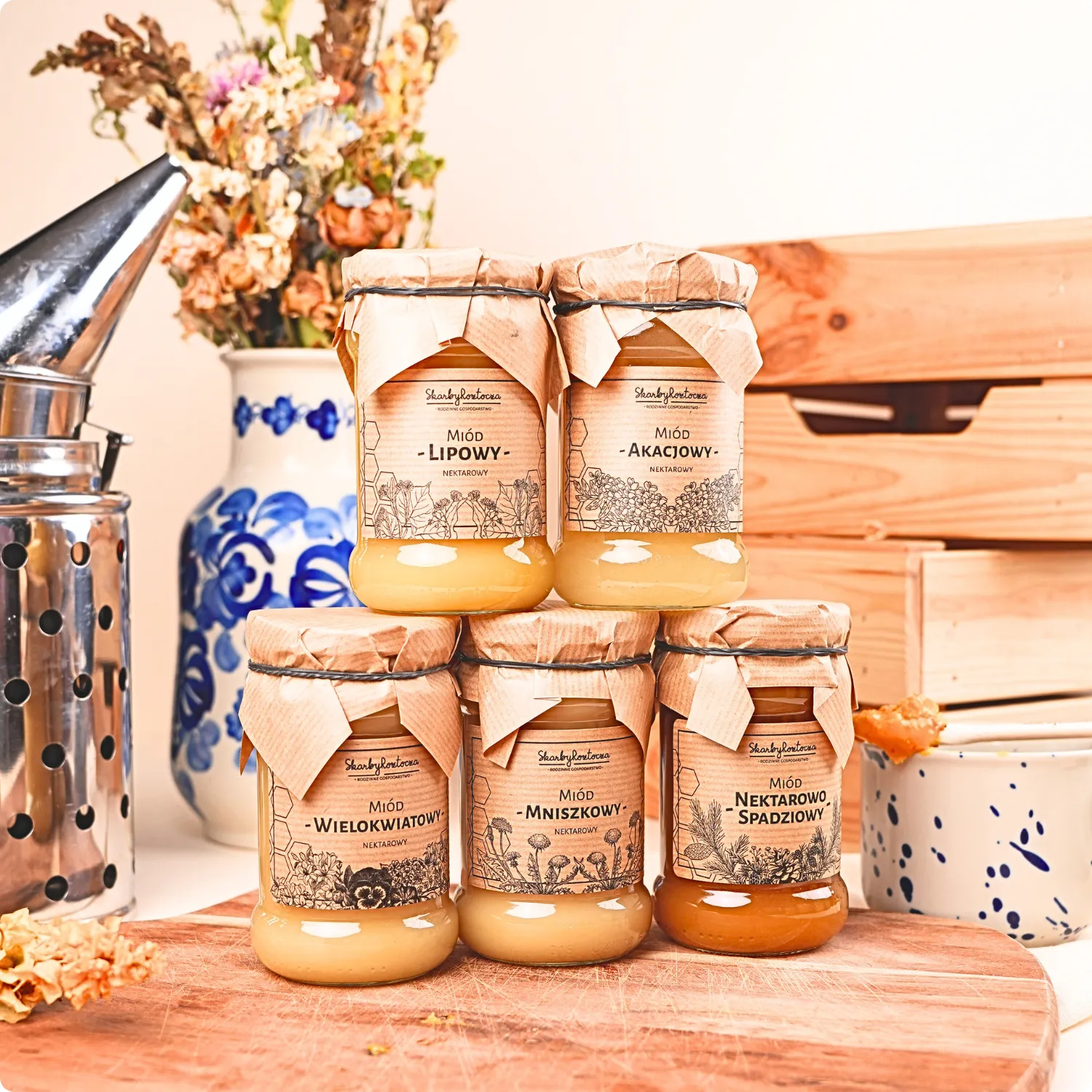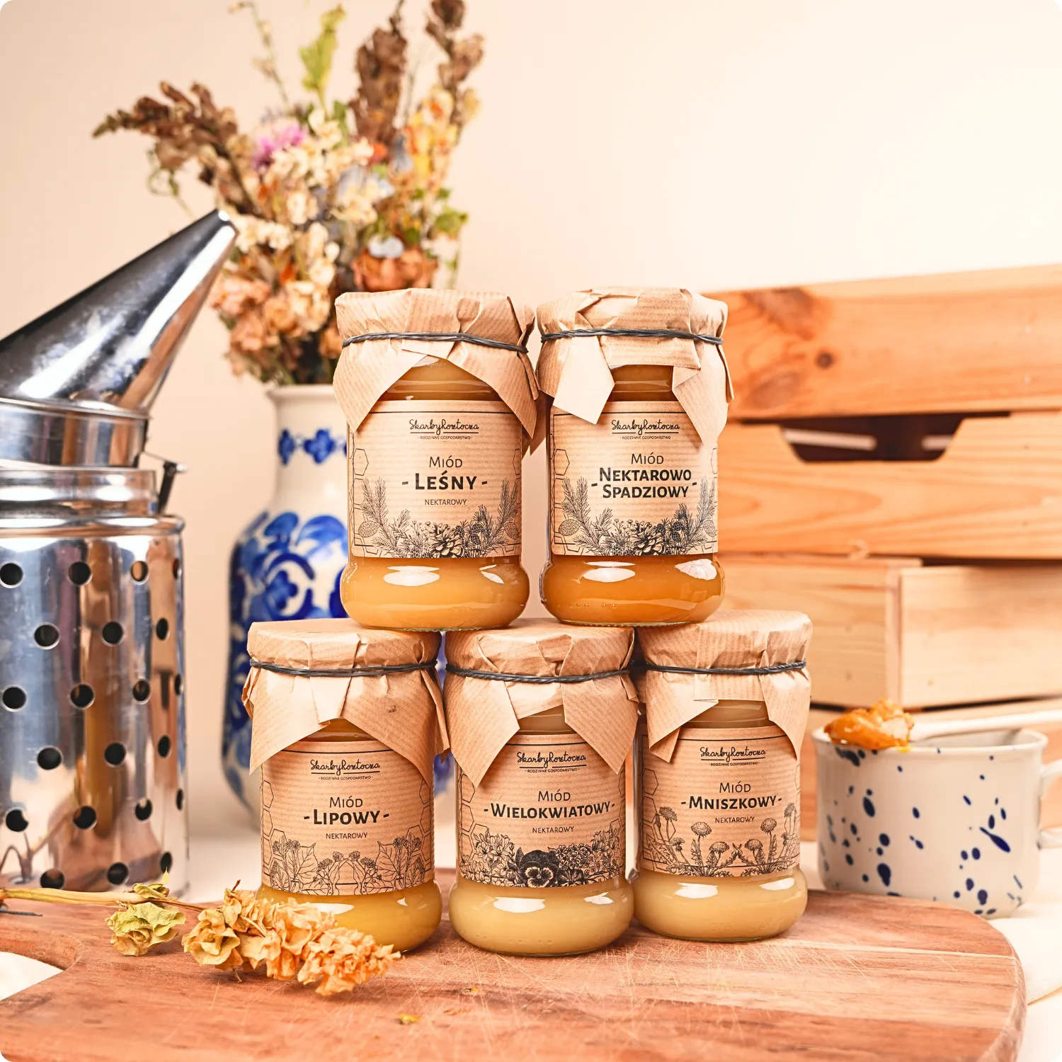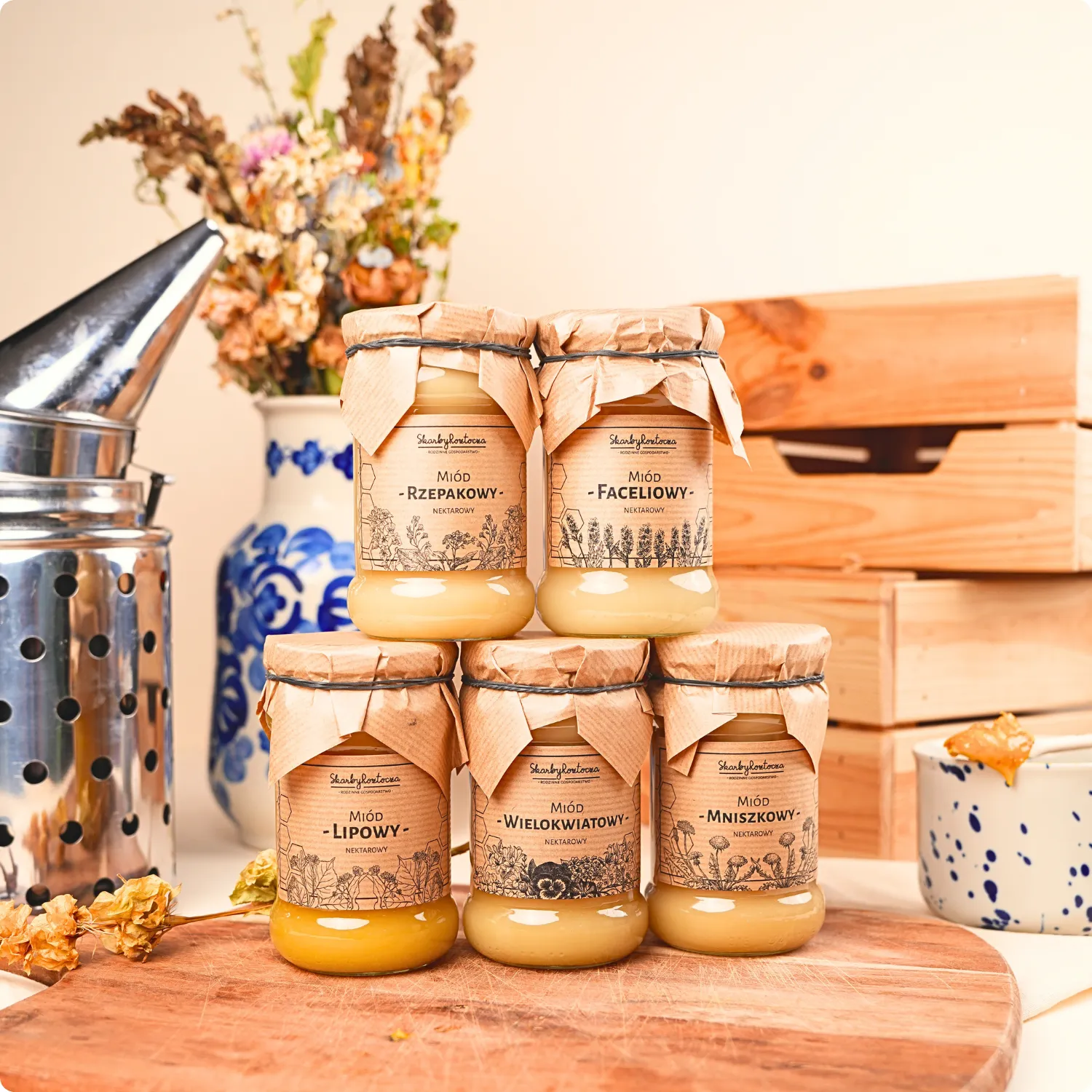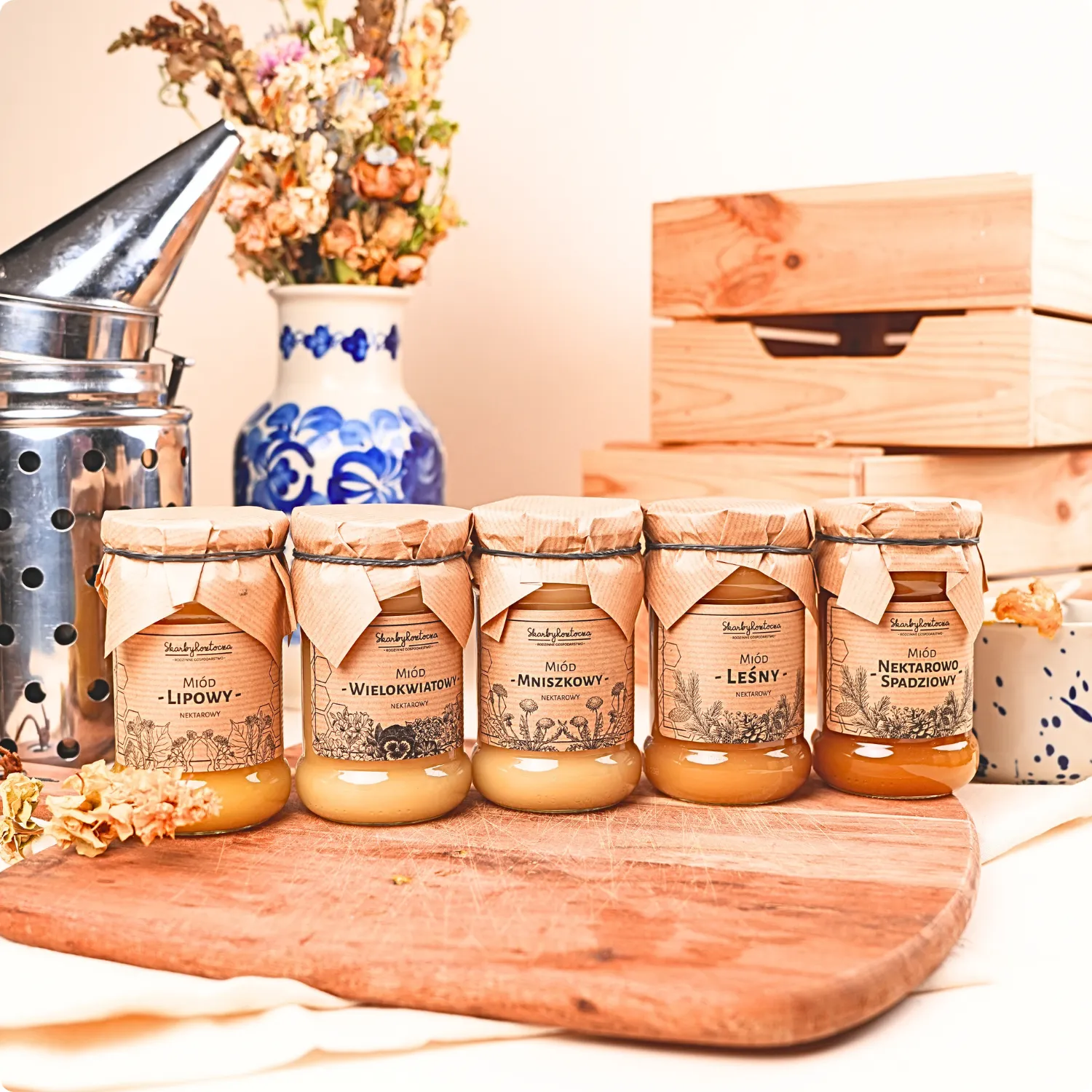 Zestaw 5 różnych miodów, dostępnych w danym sezonie.