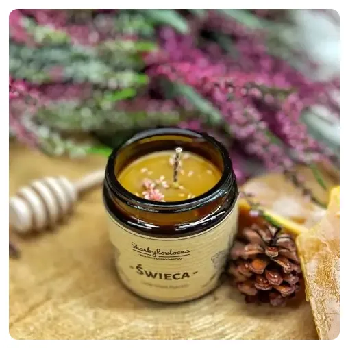 Idealne na prezent gustowne świece w słoiczku z ciemnego szkła wykonana z naturalnego wosku pszczelego i bawełnianego knotu. Świeca z wrzosem pozostawia w domu przyjemny miodowo-korzenno-woskowy aromat wzbogacony o aromat wrzosowy. Naszym zdaniem to przepiękne połączenie! Dodatkowo świeca cieszy nie tylko zmysły węchu, ale także wzroku gdyż wzbogaciliśmy je o kwiaty wrzosu, które ujrzysz po odkręceniu słoika.